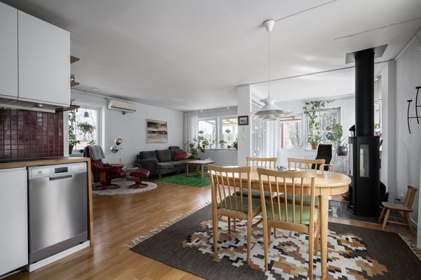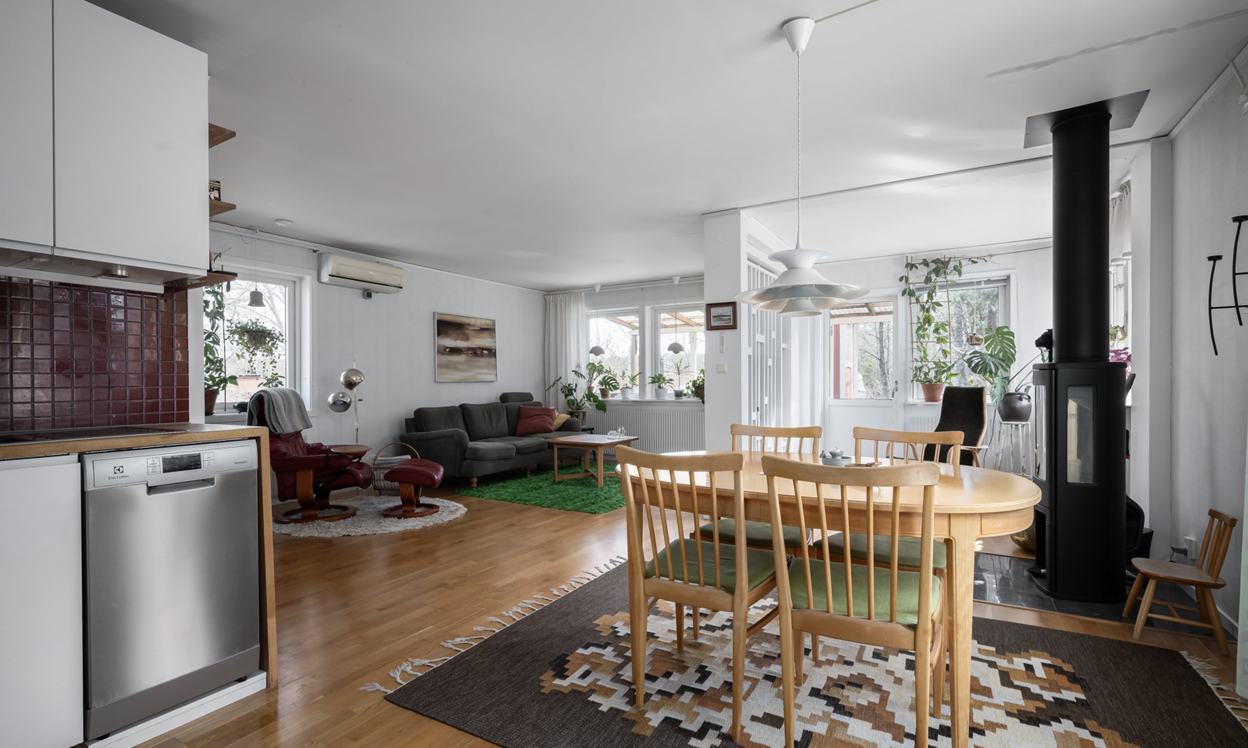 - BeskrivningHuvudbyggnaden, om ca 134 kvm, omfattar idag fem rum och kök med möjlighet till att dela av ett av sovrummen till ytterligare sovrum. Entréhallen har matta invid ytterdörren och har sedan ett mycket vackert golv som löper vidare in i vardagsrummet. Vardagsrummet har ett fantastiskt ljusinsläpp och har gott om plats för större sittgrupp. Här finns även en kamin för mysiga höstkvällar eller kalla vinterdagar. Planlösningen är öppen mot kök som erbjuder platsbyggt skafferi och köksskåp i fin gul ton. Gott om utrymme för stort matbod. Utgång finns till stor altan som har bra yta för matgrupp och loungemöbler. Vidare ryms det på entréplanet ett bra sovrum med plats för dubbelsäng och förvaringsmöblemang. Intill sovrummet finns ett av badrummen. Badrummet som är från 2005 (uppgift enligt tidigare ägare) är helkaklat och rymmer badkar, toalett och handfat. Tvättstugan är stor och har två tvättmaskiner, torktumlare och mycket bra förvaringsmöjligheter. Från tvättstugan finns det även ingång till lägenheten. Övre plan har ett perfekt allrum med utgång till balkong. Från allrummet finns ingång till en praktisk klädkammare. Möjligt att öppna upp mot sovrum för den som vill dela av sovrummet till ytterligare rum. Det intilliggande sovrummet är stort och har två fönster. Från allrummet nås även övervåningens duschrum som är renoverat 2014. Här finns utrustning bestående av dubbla handfat med kommod, toalett samt duschvägg. Det sista sovrummet är även det stort och har gott om plats för dubbelsäng och ha dessutom en halvvägg för att kunna rymma klädförvaring eller användas som sovalkov. Lägenheten om ca 50 kvm som nås från huvudbyggnaden har separat ingång men kan även nås via tvättstugan. Från entréhallen finns det dessutom utgång till källartrappen. Lägenheten rymmer idag ett renoverat duschrum (2013) med dusch, toalett, spegelskåp, handfat med kommod samt handdukstork. Även köket är fint renoverat med generösa förvaringsmöjligheter och bra bänkytor. Bra yta för matbord och även trevligt utrymme för läshörna eller ett mindre sovrum. Här finns dessutom en kamin. Utgång till stor altan som till större delen ligger under tak. Rymligt vardagsrum med gott om utrymme för soffa och annat trivselmöblemang. Även detta utrymme kan delas av för den som behöver fler rum. Från vardagsrummet nås även lägenhetens sovrum som har plats för dubbelsäng. Källare med tre stora förrådsutrymmen och ett pannrum. Resterande del är ej utgrävt och består till större delen av berg. Under lägenheten finns det ytterligare utrymme för förvaring. Den separata lägenheten om ca 91 kvm är även den mycket välplanerad och rymmer idag hall med bra yta för avhängning. Duschrum med dusch, tvättmaskin, handfat med kommod, spegelskåp, handdukstork samt toalett. Fullt utrustat kök med matplats som tidigare har haft ingång till vardagsrummet som idag fungerar som verkstad. Detta utrymme är enkelt att återställa till vardagsrum och har även bra yta som möjliggör att rummet kan delas till ytterligare rum. Från verkstaden finns det även altandörr ut till liten altan under tak. På entréplanet finns det även ingång till ett sovrum som idag används som gym. Övervåningen rymmer två rum i fil. Båda dessa har bra ytor för sovrum eller annat önskat nyttjande. Tomten omfattar hela 2 351 kvm och ligger inbäddad bland grönskan. Den grusade gårdsplanen ligger skyddad och har bra yta för parkering av flertalet bilar. På tomten finns det ett fint lusthus som har vacker vy över åkermark. Det finns även en fin bagarstuga med ugn, bastu och dusch. Dessutom finns det ett förråd/vedbod samt ett enklare skjul för cykelförvaring. Kort avstånd till motorväg där du dig snabbt tar dig till Ösmo och Nynäshamn. Till Globen globen tar resan med bil ca 35 minuter. I närheten av fastigheten avgår även buss 847 som tar dig till Ösmo station på ca 5 minuter. Korta fakta - Fantastiska möjligheter för verksamhet, generationsboende eller uthyrning - Bagarstuga med bastu - Stor källare med flertalet förråd - Lusthus - Närhet till både Ösmo och Nynäshamn För mer info kontakta ansvarig mäklare på 0708-456003
